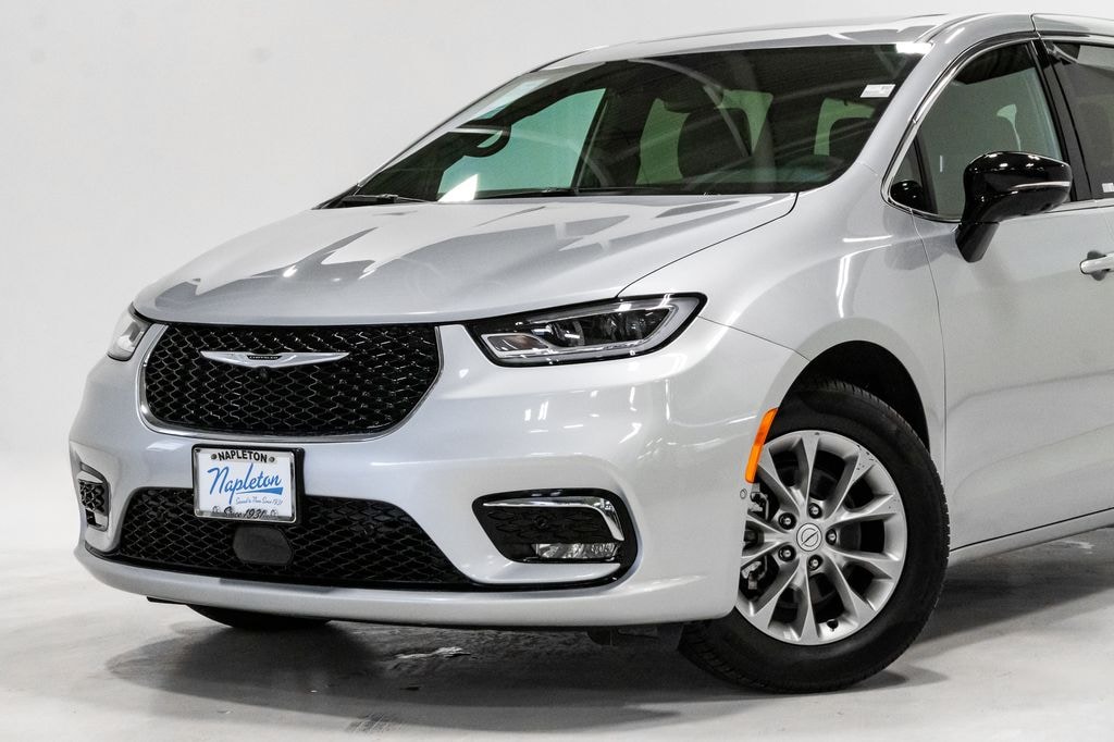 This Pacifica is well equipped with Quick Order Package 27P, Safety Sphere (360 Surround View Camera System and ParkSense Front/Rear Park Assist with Stop), Uconnect Theater Family Group (115V Auxiliary Power Outlet, 19 Harman/Kardon Speakers with Subwoofer, 2nd and 3rd Row Window Shades, 3-Channel Video Remote Control, 760 Watt Amplifier, Amazon Fire TV Built-in, Blu-Ray/DVD Player/USB Port, FamCAM Interior Camera, Hands Free Sliding Doors, High Definition Multimedia Interface, Integrated Active Noise Cancellation, Seatback Video Screens, Stow N Vac Integrated Vacuum, and Video USB Port), 13 Speakers, 18" x 7.5" Painted Aluminum Wheels, 3.25 Axle Ratio, 3rd row seats: split-bench, 4-Wheel Disc Brakes, ABS brakes, Air Conditioning, Alloy wheels, AM/FM radio: SiriusXM 360L, Apple CarPlay/Android Auto, Audio memory, Auto-dimming Rear-View mirror, Automatic temperature control, Black Seats, Brake assist, Bumpers: body-color, Compass, Delay-off headlights, Driver door bin, Driver vanity mirror, Driver's Seat Mounted Armrest, Dual front impact airbags, Dual front side impact airbags, Electronic Stability Control, Emergency communication system: Chrysler Connect, Four wheel independent suspension, Front anti-roll bar, Front Bucket Seats, Front dual zone A/C, Front fog lights, Front reading lights, Fully automatic headlights, Garage door transmitter, Gloss Black Exterior Mirrors, Heated door mirrors, Heated front seats, Heated rear seats, Heated steering wheel, Illuminated entry, Knee airbag, Low tire pressure warning, Memory seat, Nappa Leather Bucket Seats, Navigation System, Occupant sensing airbag, Outside temperature display, Overhead airbag, Overhead console, Panic alarm, ParkView Rear Back-Up Camera, Passenger door bin, Passenger seat mounted armrest, Passenger vanity mirror, Power door mirrors, Power driver seat, Power Liftgate, Power moonroof, Power passenger seat, Power steering, Power windows, Radio data system, Radio: Uconnect 5 Nav with 10.1" Display, Rain sensing wipers, Rear air conditioning, Rear reading lights, Rear window defroster, Rear window wiper, Reclining 3rd row seat, Remote keyless entry, Security system, Speed control, Split folding rear seat, Spoiler, Steering wheel mounted audio controls, Tachometer, Telescoping steering wheel, Tilt steering wheel, Touring Suspension, Traction control, Trip computer, Turn signal indicator mirrors, Variably intermittent wipers, Ventilated front seats, and Voltmeter.