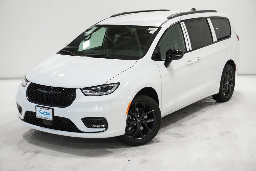This Pacifica is well equipped with Quick Order Package 27L, S Appearance Package (Anodized Ink Badging, Black Day Light Opening Moldings, Black Stow 'N Place Roof Rack, Caprice Leatherette with S Logo, Piano Black Interior Accents, Premium Fascia Upper/Lower Grille with Black Surround, Premium Rear Fascia Black, S Badge, and Wheels: 20" x 7.5" S-Model Aluminum Design 1), Safety Sphere (360 Surround View Camera System and ParkSense Front/Rear Park Assist with Stop), 10.1" Touchscreen Display, 18" x 7.5" Painted Aluminum Wheels, 3.73 Axle Ratio, 3rd row seats: split-bench, 4-Wheel Disc Brakes, 4G LTE Wi-Fi Hot Spot, 6 Speakers, ABS brakes, Air Conditioning, Alloy wheels, AM/FM radio: SiriusXM, Apple CarPlay, Apple CarPlay/Android Auto, Auto-dimming Rear-View mirror, Automatic temperature control, AWD Suspension, Black Seats, Brake assist, Bumpers: body-color, Caprice Leatherette Bucket Seats, Compass, Connectivity - US/Canada, Delay-off headlights, Disassociated Touchscreen Display, Driver door bin, Driver vanity mirror, Driver's Seat Mounted Armrest, Dual front impact airbags, Dual front side impact airbags, Electronic Stability Control, Emergency communication system: Chrysler Connect, For Details, Visit DriveUconnect.com, Four wheel independent suspension, Front anti-roll bar, Front Bucket Seats, Front dual zone A/C, Front fog lights, Front reading lights, Fully automatic headlights, Garage door transmitter, Google Android Auto, GPS Antenna Input, Heated door mirrors, Heated front seats, Heated steering wheel, Illuminated entry, Integrated Active Noise Cancellation, Integrated Center Stack Radio, Knee airbag, Low tire pressure warning, Memory seat, Occupant sensing airbag, Outside temperature display, Overhead airbag, Overhead console, Panic alarm, ParkView Rear Back-Up Camera, Passenger door bin, Passenger seat mounted armrest, Passenger vanity mirror, Power door mirrors, Power driver seat, Power Liftgate, Power steering, Power windows, Radio data system, Radio: Uconnect 5 with 10.1" Display, Rain sensing wipers, Rear air conditioning, Rear reading lights, Rear window defroster, Rear window wiper, Reclining 3rd row seat, Remote keyless entry, Security system, Speed control, Split folding rear seat, Spoiler, Steering wheel mounted audio controls, Tachometer, Telescoping steering wheel, Tilt steering wheel, Traction control, Trip computer, Turn signal indicator mirrors, USB Host Flip, Variably intermittent wipers, and Voltmeter.