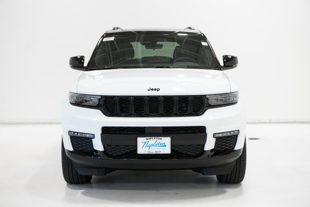 This Grand Cherokee L is well equipped with Blackout Model (Black Painted Roof, Delete Limited Badge, Dual-Pane Panoramic Sunroof, Gloss Black Exterior Accents, Interior Rear Facing Camera, and Wheels: 20" x 8.5" Black Painted Aluminum), Quick Order Package 22E, Two Tone Paint Group, 3.45 Rear Axle Ratio, 3rd row seats: split-bench, 4-Wheel Disc Brakes, 6 Speakers, ABS brakes, Active Noise Control System, Air Conditioning, Alloy wheels, AM/FM radio: SiriusXM with 360L, Anti-whiplash front head restraints, Audio memory, Auto High-beam Headlights, Automatic temperature control, Brake assist, Bumpers: body-color, Capri Leatherette Seats, Compass, Delay-off headlights, Driver door bin, Driver vanity mirror, Dual front impact airbags, Dual front side impact airbags, Electronic Stability Control, Emergency communication system, Four wheel independent suspension, Front anti-roll bar, Front Bucket Seats, Front Center Armrest w/Storage, Front dual zone A/C, Front fog lights, Front License Plate Bracket, Front reading lights, Fully automatic headlights, Garage door transmitter, Heated door mirrors, Heated front seats, Heated rear seats, Heated steering wheel, Illuminated entry, Knee airbag, Low tire pressure warning, Manual Fold Seatbacks, Memory seat, Model Year Tracking, Navigation System, Normal Duty Suspension, Occupant sensing airbag, Outside temperature display, Overhead airbag, Overhead console, Panic alarm, ParkView Rear Back-Up Camera, Passenger door bin, Passenger vanity mirror, Power door mirrors, Power driver seat, Power Liftgate, Power passenger seat, Power steering, Power windows, Radio data system, Radio: Uconnect 5 Nav w/10.1" Display, Rear air conditioning, Rear anti-roll bar, Rear reading lights, Rear window defroster, Rear window wiper, Reclining 3rd row seat, Remote keyless entry, Security system, Speed control, Speed-Sensitive Wipers, Split folding rear seat, Spoiler, Steering wheel mounted audio controls, Tachometer, Telescoping steering wheel, Tilt steering wheel, Traction control, Trip computer, Turn signal indicator mirrors, Variably intermittent wipers, Voltmeter, and Wheels: 18" x 8.0" Polished/Painted Aluminum.