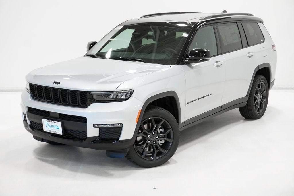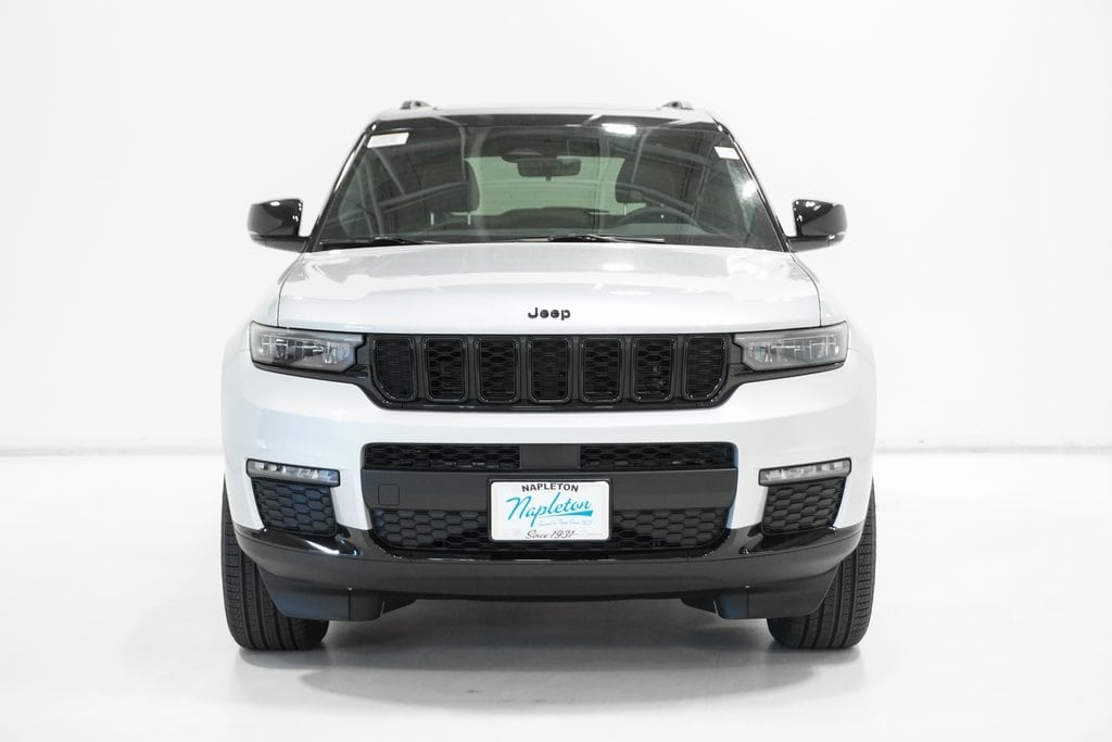 This Grand Cherokee L is well equipped with Quick Order Package 22E, 3.45 Rear Axle Ratio, 3rd row seats: split-bench, 4-Wheel Disc Brakes, 6 Speakers, ABS brakes, Active Noise Control System, Air Conditioning, Alloy wheels, AM/FM radio: SiriusXM with 360L, Anti-whiplash front head restraints, Audio memory, Auto High-beam Headlights, Automatic temperature control, Brake assist, Bumpers: body-color, Capri Leatherette Seats, Compass, Delay-off headlights, Driver door bin, Driver vanity mirror, Dual front impact airbags, Dual front side impact airbags, Dual-Pane Panoramic Sunroof, Electronic Stability Control, Emergency communication system, Four wheel independent suspension, Front anti-roll bar, Front Bucket Seats, Front Center Armrest w/Storage, Front dual zone A/C, Front fog lights, Front License Plate Bracket, Front reading lights, Fully automatic headlights, Garage door transmitter, Heated door mirrors, Heated front seats, Heated rear seats, Heated steering wheel, Illuminated entry, Interior Rear Facing Camera, Knee airbag, Low tire pressure warning, Manual Fold Seatbacks, Memory seat, Model Year Tracking, Navigation System, Normal Duty Suspension, Occupant sensing airbag, Outside temperature display, Overhead airbag, Overhead console, Panic alarm, ParkView Rear Back-Up Camera, Passenger door bin, Passenger vanity mirror, Power door mirrors, Power driver seat, Power Liftgate, Power passenger seat, Power steering, Power windows, Radio data system, Radio: Uconnect 5 Nav w/10.1" Display, Rear air conditioning, Rear anti-roll bar, Rear reading lights, Rear window defroster, Rear window wiper, Reclining 3rd row seat, Remote keyless entry, Security system, Speed control, Speed-Sensitive Wipers, Split folding rear seat, Spoiler, Steering wheel mounted audio controls, Tachometer, Telescoping steering wheel, Tilt steering wheel, Traction control, Trip computer, Turn signal indicator mirrors, Variably intermittent wipers, Voltmeter, and Wheels: 18" x 8.0" Polished/Painted Aluminum.