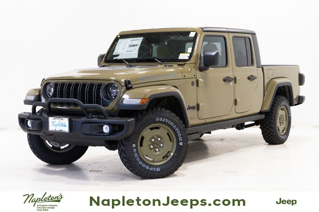 This Gladiator is well equipped with Convenience Group (Air Conditioning with Auto Temp Control, Cluster 7.0" TFT Color Display, Corning Gorilla Glass, Daytime Running Lamp System, Emergency/Assistance Call, Front Door Locks 2-Door Passive Entry, Heated Front Seats, Heated Steering Wheel, Remote Start System, and Universal Garage Door Opener), Quick Order Package 24T Willys 41 (2-Piece Body Color Fender Flares, 4WD Willys '41 Tailgate Decal, 97 Mph Vehicle Max Speed Calibration, Advanced Brake Assist, Automatic Headlamps, Auxiliary Switches, Central ADAS Decision Module (CADM), Class IV Receiver Hitch, Cloth Low-Back Bucket Seats, Daytime Running Lamps LED Accents, Deep Tint Sunscreen Windows, E-Locker Rear Axle, Front Heavy Duty Red Accent Shock Absorbers, Front LED Fog Lamps, Full Speed Forward Collision Warning Plus, Green Soul Cloth Wrapped Mid-Bolster, Heavy-Duty Engine Cooling, Increased Travel Export Tuned Suspension, LED Premium Reflector Headlamps, LED Taillamps, MOPAR All-Weather Slush Mats, MOPAR Black Hood Graphic, MOPAR Triple Hoop Grille Guard, Off-Road Plus Mode, Performance Hood, Power Heated Mirrors, Premium Wrapped Steering Wheel, Protection Sill Rails, Rear Heavy Duty Red Accent Shock Absorbers, Security Alarm, Steel Front Bumper, Sun Visors with Illuminated Vanity Mirrors, Trailer Hitch Zoom, Wheels: 17" x 7.5" Fully Painted, Willys '41, Willys '41 Retro Edition Gladiator Decal, and Willys '41 US Edition U.S. Hood Decal), 110 Mph Vehicle Max Speed Calibration, 12.3" Touchscreen Display, 3.73 Rear Axle Ratio, 4-Wheel Disc Brakes, 4G LTE Wi-Fi Hot Spot, 8 Speakers, ABS brakes, Air Conditioning, Alexa Built-in, AM/FM radio: SiriusXM with 360L, Apple CarPlay, Apple CarPlay/Android Auto, Black 3-Piece Hard Top, Brake assist, Compass, Connectivity - US/Canada, Delay-off headlights, Driver door bin, Driver vanity mirror, Dual front impact airbags, Dual front side impact airbags, Electronic Stability Control, For Details, Visit DriveUconnect.com, Freedom Panel Storage Bag, Front anti-roll bar, Front Bucket Seats, Front Center Armrest w/Storage, Front fog lights, Front reading lights, Google Android Auto, Illuminated entry, Integrated Center Stack Radio, Integrated roll-over protection, Low tire pressure warning, MOPAR Spray in Bedliner, Normal Duty Suspension, Occupant sensing airbag, Outside temperature display, Overhead airbag, Panic alarm, ParkView Rear Back-Up Camera, Passenger door bin, Passenger vanity mirror, Power steering, Power windows, Radio data system, Radio: Uconnect 5 with 12.3" Display, Rear anti-roll bar, Rear reading lights, Rear Sliding Window, Rear Window Defroster, Remote keyless entry, SiriusXM Radio Service, SiriusXM with 360L, Speed control, Split folding rear seat, Steering wheel mounted audio controls, Tachometer, Telescoping steering wheel, Tilt steering wheel, Traction control, Trip computer, USB Host Flip, Variably intermittent wipers, Voltmeter, and Wheels: 17" x 7.5" Black Steel Styled.