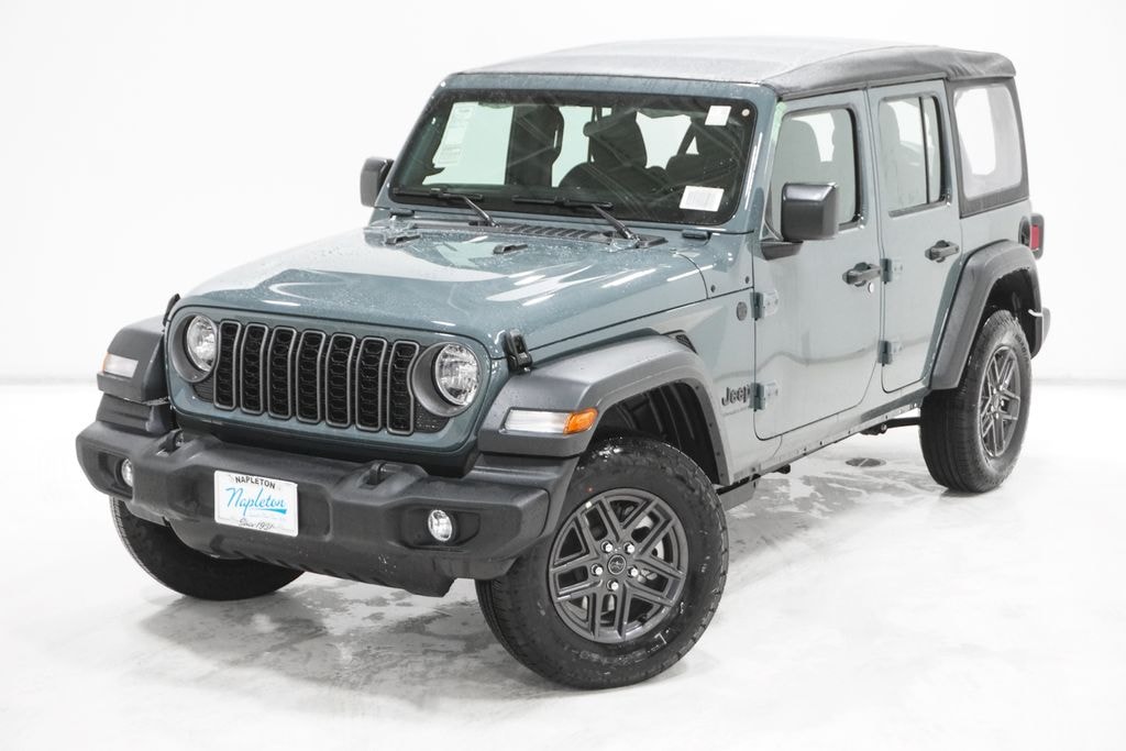 This Wrangler is well equipped with Quick Order Package 22B Sport, 12.3" Touchscreen Display, 3.45 Overall Top Gear Ratio, 4-Wheel Disc Brakes, 4G LTE Wi-Fi Hot Spot, 8 Speakers, ABS brakes, Air Conditioning, AM/FM radio: SiriusXM with 360L, Apple CarPlay, Apple CarPlay/Android Auto, Aux Battery, Brake assist, Compass, Connectivity - US/Canada, Delay-off headlights, Driver door bin, Driver vanity mirror, Dual front impact airbags, Dual front side impact airbags, Electronic Stability Control, For More Info, Call 800-643-2112, Front anti-roll bar, Front Bucket Seats, Front Center Armrest w/Storage, Front fog lights, Front reading lights, Google Android Auto, Illuminated entry, Integrated Center Stack Radio, Integrated roll-over protection, Low tire pressure warning, Manufacture Statement of Origin, MOPAR All-Weather Floor Mats, Myflexcare Service Plan, Non-Lock Fuel Cap Without Discriminator, Normal Duty Suspension, Occupant sensing airbag, Outside temperature display, Overhead airbag, Panic alarm, ParkView Rear Back-Up Camera, Passenger door bin, Passenger vanity mirror, Power steering, Power windows, Radio data system, Radio: Uconnect 5 with 12.3" Display, Rear anti-roll bar, Rear reading lights, Remote keyless entry, SiriusXM Radio Service, SiriusXM with 360L, Speed control, Split folding rear seat, Steering wheel mounted audio controls, Stop-Start Dual Battery System, Tachometer, Telescoping steering wheel, Tilt steering wheel, Traction control, Trip computer, Variably intermittent wipers, Wheels: 17" x 7.5" Black Steel Styled, and Wheels: 17" x 7.5" Gray.