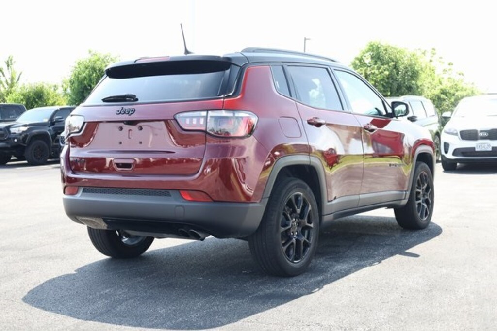 This Compass is well equipped with Convenience Group (115V Auxiliary Power Outlet, 2nd Row USB Type A/C Charge Only, Air Conditioning ATC w/Dual Zone Control, All-Season Floor Mats, Auto-Dimming Rear-View Mirror, Foot Activated Open 'N Go Liftgate, Heated Front Seats, Heated Steering Wheel, Humidity Sensor, Leather Wrapped Steering Wheel, Power Adjust 8-Way Driver Seat, Power Liftgate, Remote Start System, Reversible Carpet/Vinyl Cargo Mat, Security Alarm, Universal Garage Door Opener, Vehicle Information Center, and Windshield Wiper De-Icer), Quick Order Package 2GB Altitude (Altitude Special Edition, Black Day Light Opening Moldings, Black Headliner, Black Roof, Bright Exhaust Tip, Gloss Black Badges, Gloss Black Grille & Crosshairs, Gloss Black Lower Rear Fascia Valance, Light Tungsten Interior Accent Stitching, Piano Black Interior Accents, and Wheels: 18" x 7" Gloss Black Painted Aluminum), 4WD, 17" x 7" Painted Aluminum Wheels, 3.73 Axle Ratio, 4-Wheel Disc Brakes, 6 Speakers, ABS brakes, Air Conditioning, Alloy wheels, AM/FM radio: SiriusXM, Anti-whiplash front head restraints, Auto High-beam Headlights, Brake assist, Bumpers: body-color, Compass, Delay-off headlights, Driver door bin, Driver vanity mirror, Dual front impact airbags, Dual front side impact airbags, Electronic Stability Control, Emergency communication system: SiriusXM Guardian, Four wheel independent suspension, Front anti-roll bar, Front Bucket Seats, Front Center Armrest w/Storage, Front fog lights, Front License Plate Bracket, Front reading lights, Fully automatic headlights, Heated door mirrors, Illuminated entry, Knee airbag, Leather Shift Knob, Low tire pressure warning, Occupant sensing airbag, Outside temperature display, Overhead airbag, Overhead console, Panic alarm, ParkView Rear Back-Up Camera, Passenger door bin, Passenger vanity mirror, Power door mirrors, Power steering, Power windows, Premium Cloth/Vinyl Bucket Seats, Radio: Uconnect 5 w/10.1" Display, Rear anti-roll bar, Rear seat center armrest, Rear window defroster, Rear window wiper, Remote keyless entry, Roof rack: rails only, Speed control, Split folding rear seat, Spoiler, Steering wheel mounted audio controls, Tachometer, Telescoping steering wheel, Tilt steering wheel, Traction control, Trip computer, and Variably intermittent wipers.
